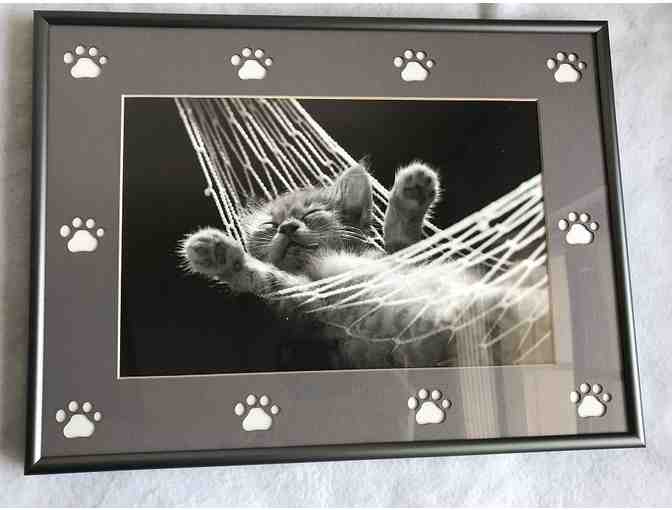 This is just the purrrfect thing to put on your wall to remind you that you need to relax. I mean who doesn't love a little sleeping kitten in a tiny hammock?! This has a black metal frame with glass front. Matte has cat footprint cutouts. Picture is black and white. Perfect condition