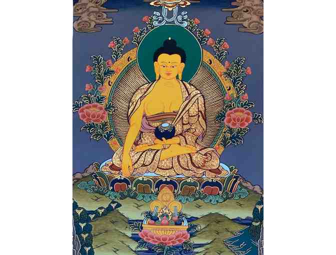 The successful bidder for this lot will receive the handpainted Tibetan thangka painting "Shakyamuni Buddha" from Gorkha Nepal. Shakyamuni is the historical Buddha born in Lumbini Nepal in 6th Century BC.