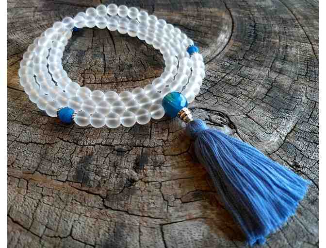 This matte crystal mala 108-bead necklace mala from Great Eastern Sun Store is both stylish and practical. It has matte blue fire agate markers and a faceted blue sardonyx agate guru bead, strung on a metal beading wire, with acrylic thread tassel.