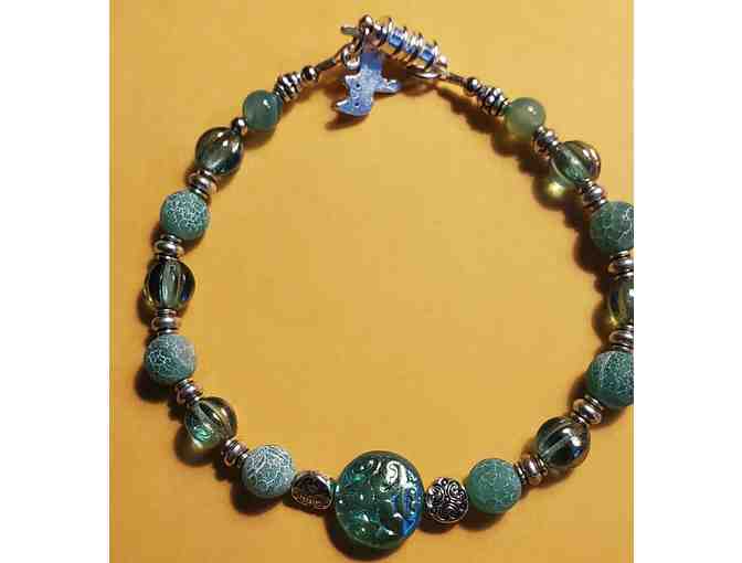 8" bracelet with aqua/teal glass beads with silver cat and strong magnetic clasp.