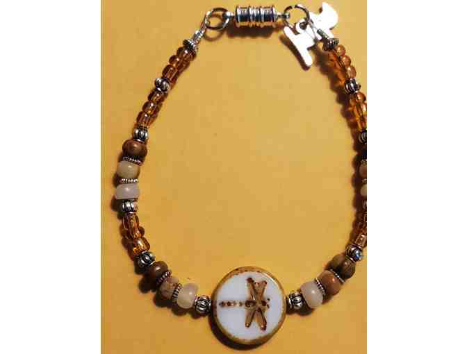 8" bracelet with amber, brown and silver glass beads with striking dragonfly center focal peice with cat charm and strong magnetic clasp.