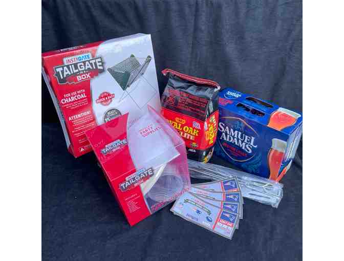 Four (4) tickets to a Patriots home game during the 2021 Season (game to be decided) with a tailgate package featuring a grill and charcoal, a 12 pack of Sam Adams Lager, and all the utensils you'll need for the perfect tailgate party!