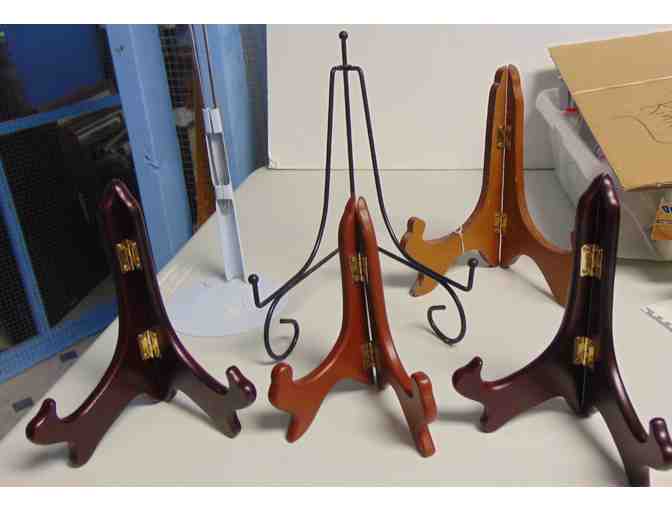 Five plate stands for 8" to 11" size plates. Four wooden hinged and one metal stand.