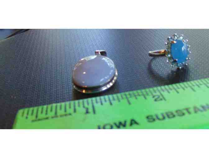 Pendant and Ring set in .925 Sterling Silver. Ring has Blue Topaz around edges. Do not know what the center stone is.