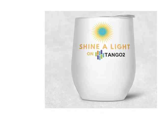 You can "SHINE" while you sip your wine from this white 12 oz. stemless wine glass tumbler with lid featuring "Shine a Light on TANGO2" and the Foundation logo on the front.