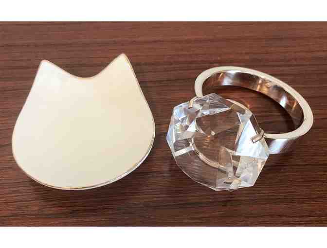 This is the perfect set for any jewelry lover. White jewlery dish in white ceramic in the shape of a cat's face and a large faux diamond ring to add a little bling to your room decor.