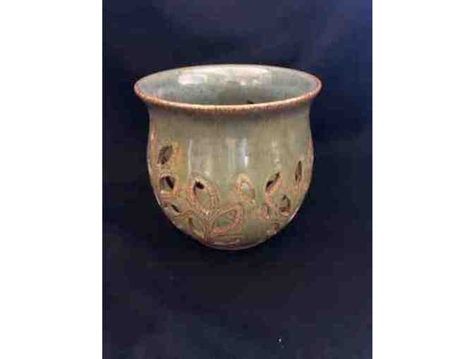Blue Handmade Pottery Candle Holder with Open Lattice-Work Leaves - Signed