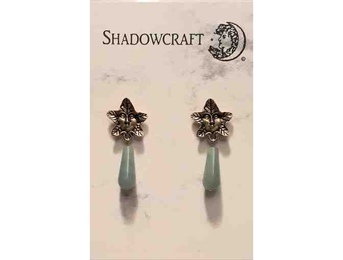 Green Man earrings in gold tone, lead-free pewter, with aventurine drops, surgical steel posts; 1 3/8" long;