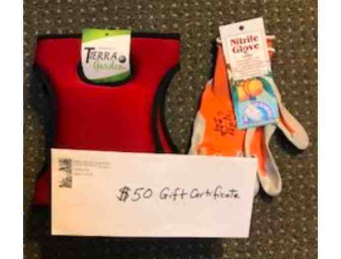 This basket contains a $50 gift certificate to Mad River Gardens, plus nitrile gardening gloves and knee pads.