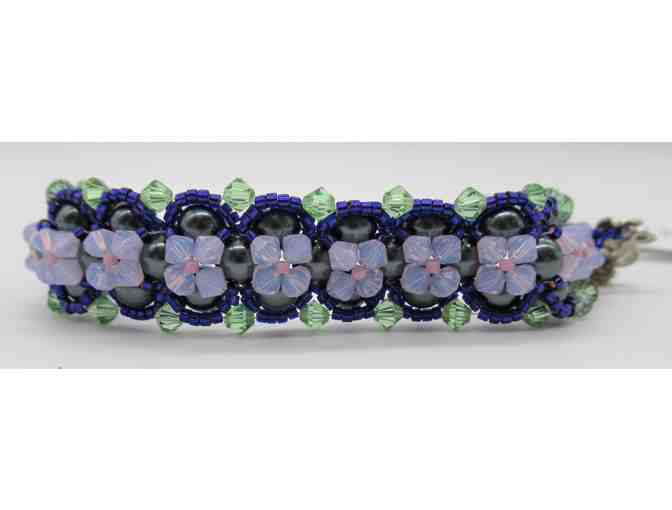 Hand-beaded bracelet by Susan Johns showcasing green and pink Swarovski crystals, green tone pearls, and purple accent beads. Clasp is sterling silver.