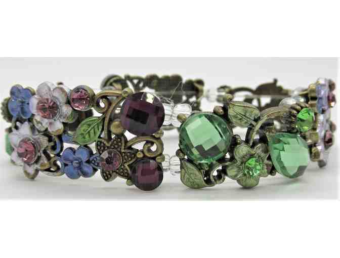 This handmade bracelet is made of metal rectangles embedded with beautiful green, pink and deep purple shimmery accent beads. The beads are set amidst leaves, flowers and stars. The metal pieces are attached with an elastic cord and separated by transparent beads. It is creates a beautiful, fun and colorful accent piece. Easy-to-wear elastic band.