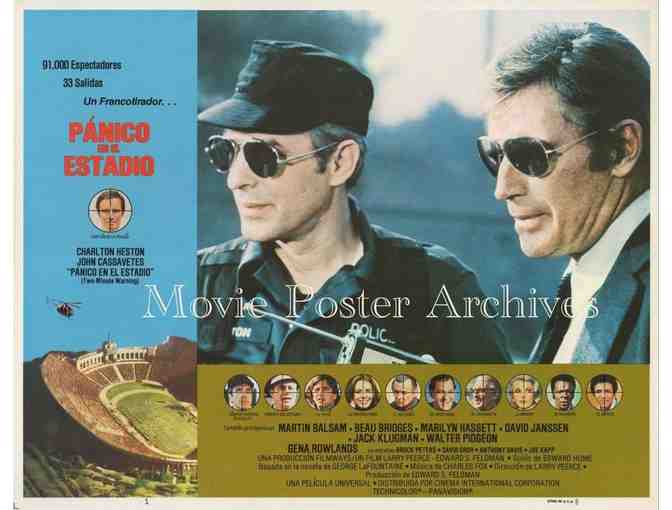 Two Minute Warning, the 1976 Larry Peerce football crime thriller starring Charlton Heston, John Cassavetes, Martin Balsam, Beau Bridges, Marilyn Hassett, David Janssen, Walter Pidgeon, Gena Rowlands, Brock Peters and Jack Klugman.