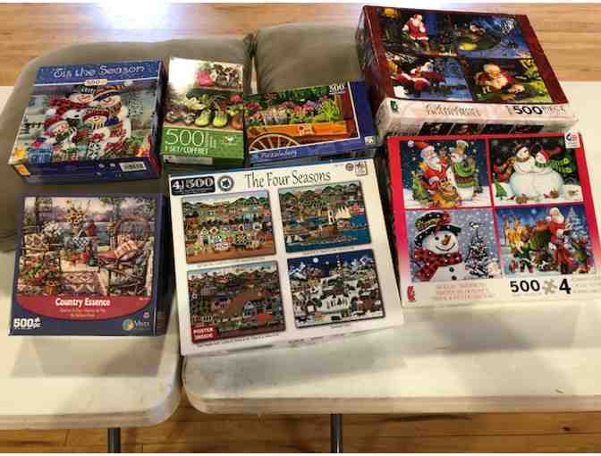 Add a collection of charming 500 piece puzzles to your home and be content for the winter holidays. These puzzles were used once and have all the pieces in the box.