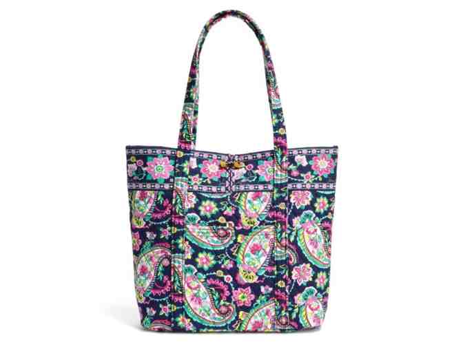 Quilted fabric tote with pink, green, yellow flower paisley design.