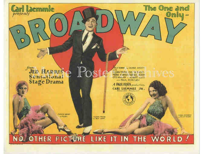 Broadway, the 1929 Pal Fejos romantic crime musical starring Glenn Tryon, Evelyn Brent, Merna Kennedy, Thomas E. Jackson, Robert Ellis, Otis Harlan, Paul Porcasi and Marion Lord.