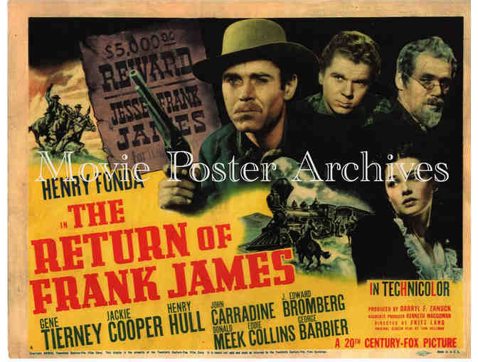 The Return of Frank James, the 1940 Fritz Lang outlaw western sequel starring Henry Fonda, Gene Tierney, Jackie Cooper, Hunry Hull, John Carradine, J. Edward Bromberg, Donald Meek, Eddie Collins, George Barbier, Russell Hicks and Ernest Whitman.