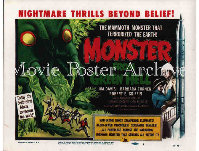 Monster From Green Hell, the 1957 Kenneth G. Crane monster sci-fi horror starring Jim Davis, Barbara Turner, Robert Griffin, Eduardo Ciannelli, Vladimir Sokoloff, Joel Fluellen, Tim Huntley, LaVerne Jones and Frederic Potler.