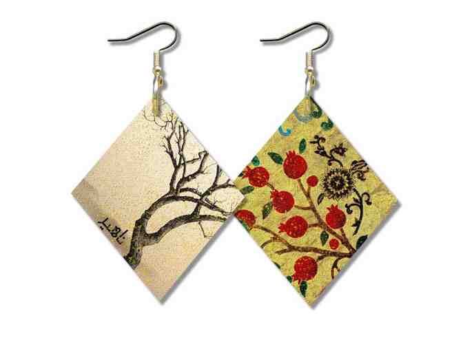 These Art-Wear earrings are one of a kind. Handmade by Nahid Hagigat, they are inspired by her own paintings. Each earring is put together with the utmost attention and skill. The earrings have two layers of painted canvases, each layer with a different design (one for the front and one for the back). Make sure to handle with care and keep them dry.
