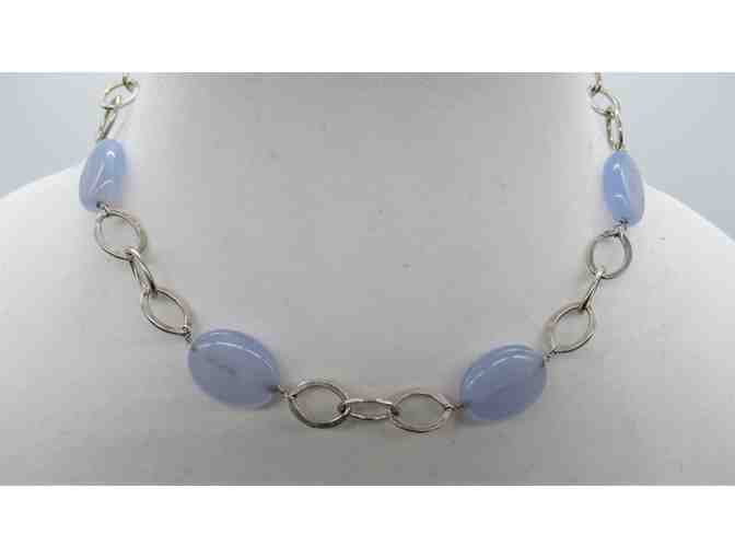 Understated elegance. This beautiful necklace features 4 opaque, pale lavender Chalcedony gems (3/4" x 1/2" each) on a 15.5" silver link style chain with lobster claw clasp.