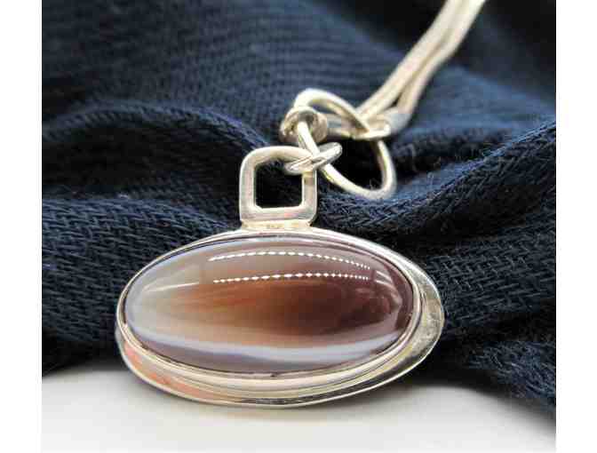 Inspired. Effortless. Timeless. This beautiful vintage Baroni necklace features an 18" .925 sterling silver snake chain, and an oval agate pendant (0.5" x 1"). This piece perfectly showcases the easy and creative vibe for which Baroni is known! Pre-owned, like new.