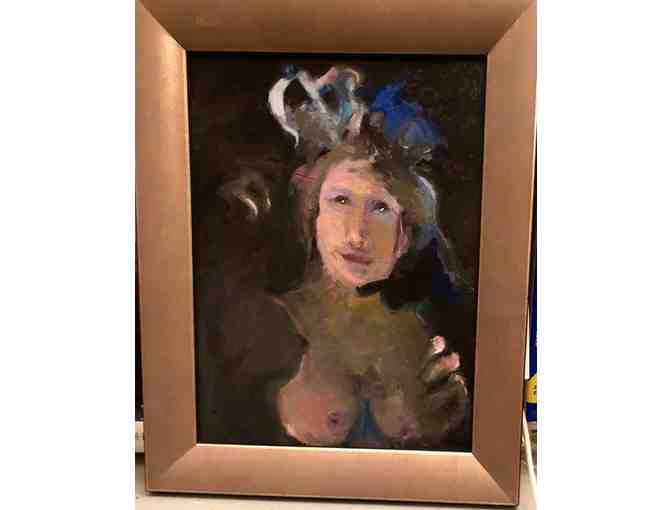 Jennifer Undaunted is an original work from artist, Jane Hart. This oil painting of an innocent young woman unfazed by hands of an otherwise unseen molester is 11 1/2" x 14 1/2" framed.