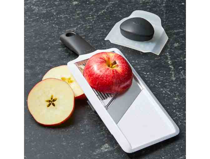 NEW in package- Mandoline Slicer- With a soft-grip knob, sharp stainless blade, and view-through base OXO® versatile, hands-on prep tool cuts even slices in three thicknesses onto a cutting board or right over a plate or bowl. Food holder protects hands and cover the blade when not in use; soft foot hooks over bowl for slicing stability.