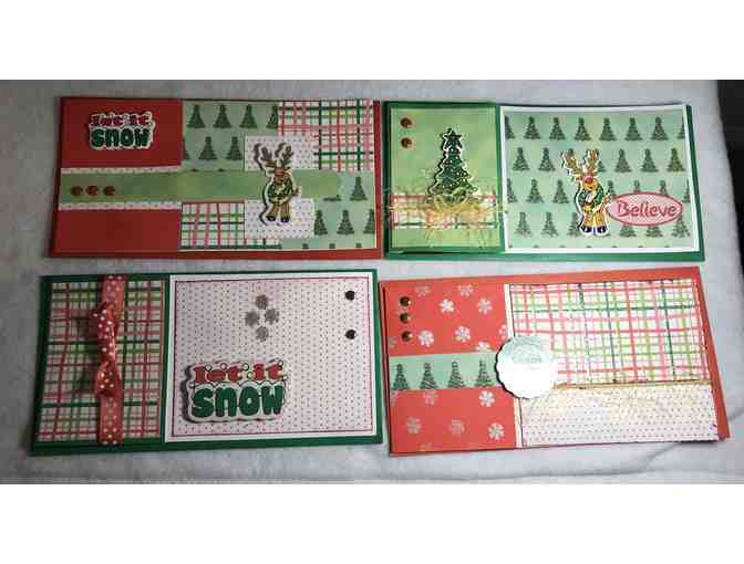 Set of 4 handmade Christmas cards. Each is 8 in x 4 in and comes with matching envelope. Opens on the lefthand side and has a holiday greeting inside.