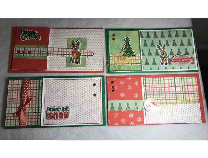 Set of 4 handmade Christmas cards. Each is 8 in x 4 in and comes with matching envelope. Opens on the lefthand side and has a holiday greeting inside.