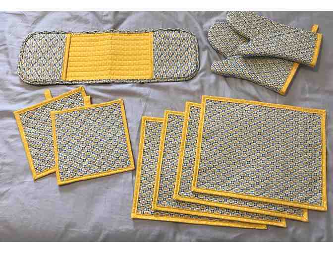 This adorable 9 piece kitchen decor set includes 4 placemats, 2 trivets, 2 oven mits, and 1 double oven mit. All the pieces feature a yellow and blue daisy pattern with yellow with white polka dot accents. The perfect house warming present or Christmas gift. All pieces have been created with care and they look like they will see a lot of use before they wear out.