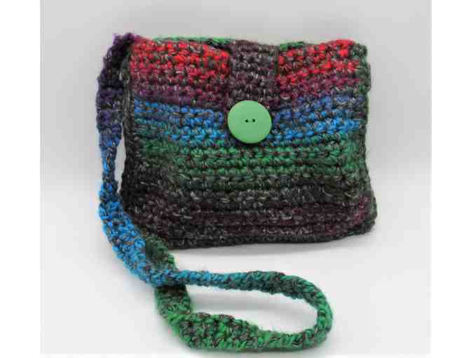 This handbag was crocheted by hand with red, purple, blue, green, and gray yarn with a matching shoulder strap and a button latch. The interior is lined with green and blue fabric.