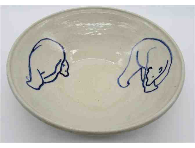 Mid size shallow bowl in cream colored glaze with two playful bears outlined in blue glaze. The exterior has five ridges that add interest. Great for soups, salads or for serving. This bowl was hand-thrown in Humboldt County by Ingrid Nickelsen.