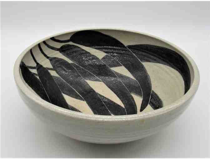 This large serving size bowl has images of larger than life chili peppers in black against a beige glazed background. Beautiful as an accent piece or maybe to hold fruit on the counter. This bowl was hand-thrown in Humboldt County by Ingrid Nickelsen.