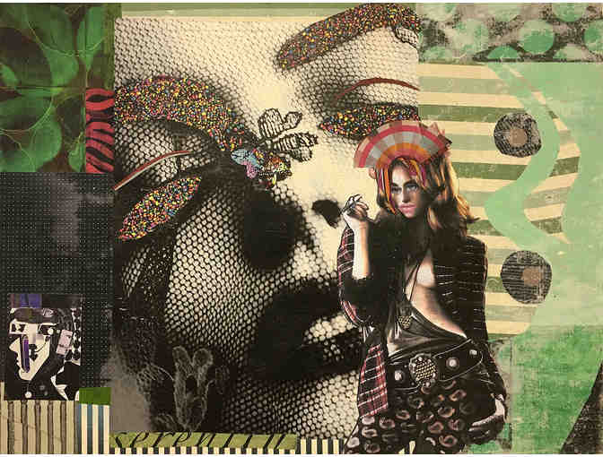 SEX CELEBRITY depicts a close-up face of an actress in the background and a sultry model standing in front from artist, Nancy Egol Nikkal. Unframed acrylic and papers on 12" x 16" panel.