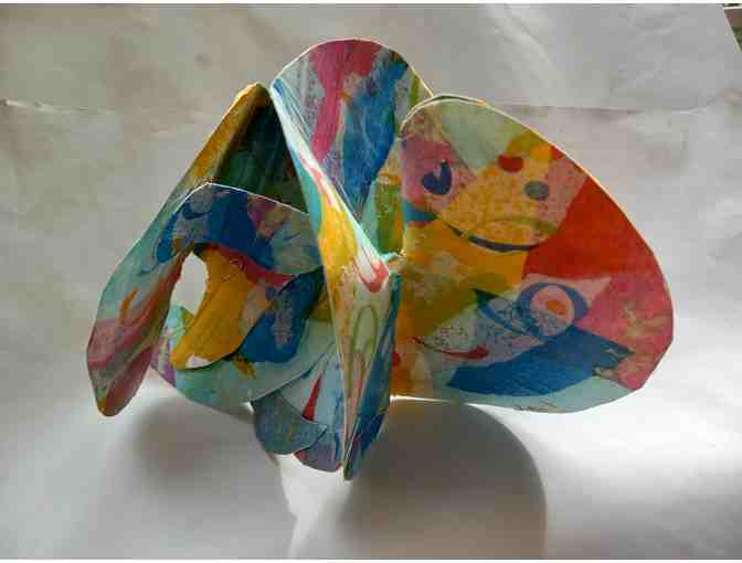 Hyperbolic Ball is an original collage on paper, 7"H x 11" x 7", from artist, Sheila Benedis.