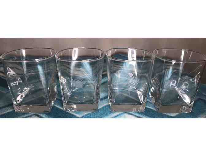 This set of 4 drinking glasses was etched with beautiful patterns featuring 3 floral designs and one bee.