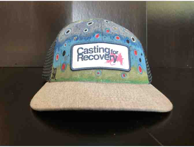 Here's an amazing and fun Casting for Recovery trucker hat that has now been made into a piece of art! It's hand painted by artist Jodi Monahan of Missoula, MT whose artistic talents are unending. You'll be the only one who has one so get ready for others to want it! Jodi has painted the hat with fish skin colors. She is well known for her fish and fly pattern paintings she creates with an amazing recall for color, design and splash. Dress up your collection of lids with this one!