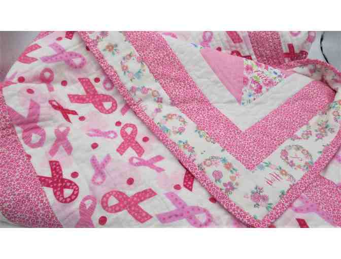 Beautifully handmade breast cancer cozy quilt in honor of friends with breast cancer. Reversible quilt with pink-themed patterns: one side includes several floral patterns and encouraging words, "Faith", "Hope"; the other side displays soft flannel fabric with pink breast cancer ribbons. Cuddling up with this quilt would bring comfort, warmth and hope!