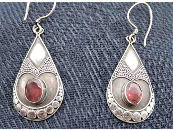 Teardrop shaped silver earrings with beautiful details and a Garnet gemstone.