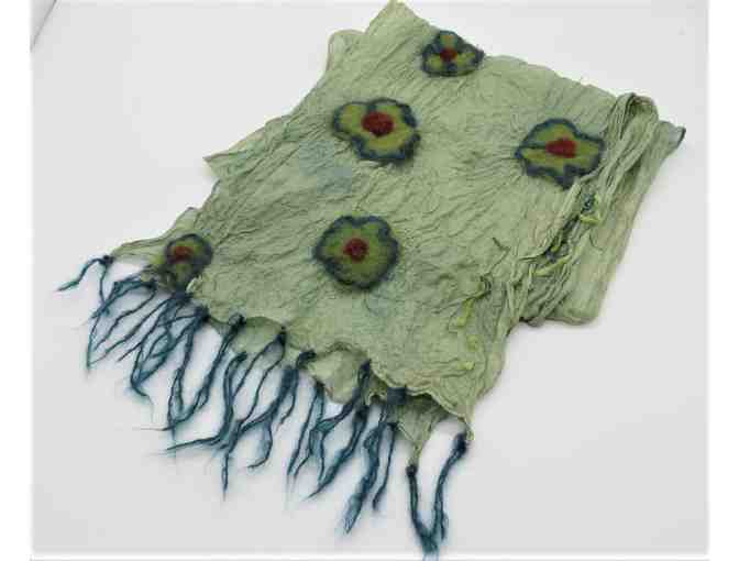 Light green soft silky crinkled fabric with cute and quirky felted wool flowers. The flowers are in green, rust and blue. Additionally, there are wool tassels on the ends of the scarf and thread and wool accents strategically placed. Beautifully executed and a thing of beauty.
