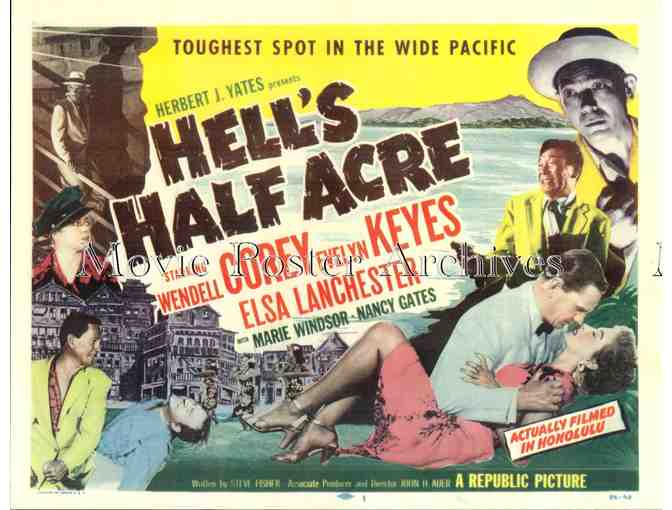 Hells Half Acre, the 1954 John H. Auer Hawaiian island romantic thriller starring Wendell Corey, Evelyn Keyes, Elsa Lanchester, Marie Windsor, Nancy Gates and Keye Luke.