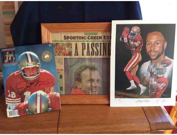 1 Autographed Copy of sports magazine, 1 Autographed Copy of Newspaper...both by Montana. 1 8x10 Photo of Jerry Rice Signed by artist