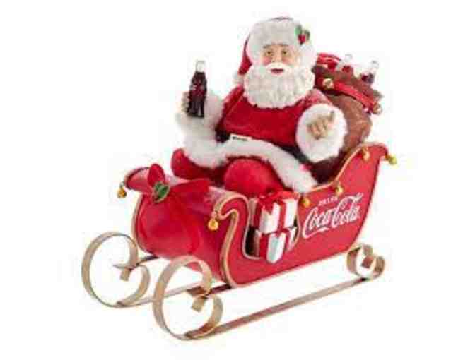 Decorate your home with this limited edition Coca-Cola Santa table piece designed by Kurt Adler. It features Santa in a glittered red Coca-Cola sleigh holding a Coca-Cola bottle. His sleigh is filled with presents and a sack decorated with gold bells. A red velvet bow with holly leaves and berries completes the look.