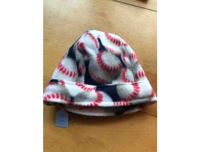 This hat is a simple fleece hat that will fit a baby - it measures about 5.5" X 6". white and red with baseballs - simple and cozy! Handmade and donated by Amy Johnson.