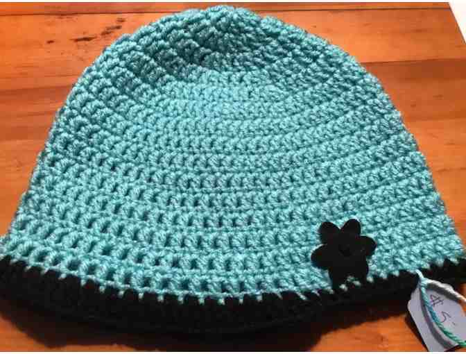 One Hand Crocheted Larger Hat *Turquoise with Black Trim *Made in Starksboro!