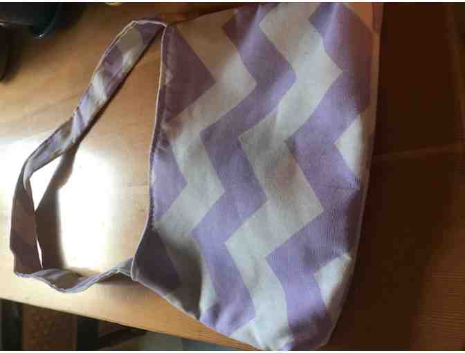 The body of this bag measures 10" X 7" Beautiful light purple and white wide striped print with 27" straps! Perfect for a preschooler's "purse" or any other use you can think of! Created and donated by Amy Johnson. See similar bags in separate auctions!