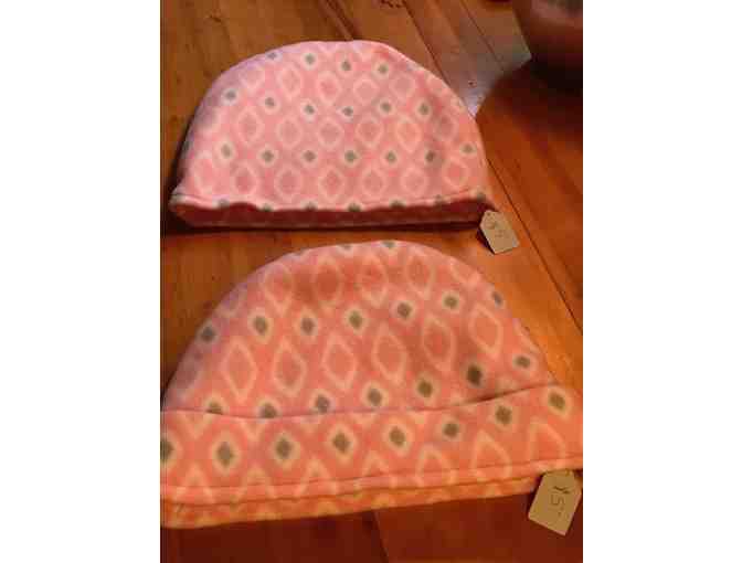 These hats are simple, and made of cozy fleece (one has a cuff) - they will fit older children - each measures about 8.5" X 8.5". Light pink with gray and white diamonds - twice the fun! Handmade and donated by Amy Johnson.
