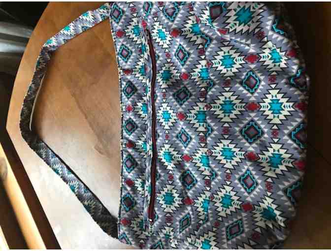 The body of this bag measures 11" X 15.5". The strap measures 31" - and there is a zipper both inside and outside. Created and donated by Amy Johnson. See similar bags offered in separate auctions.