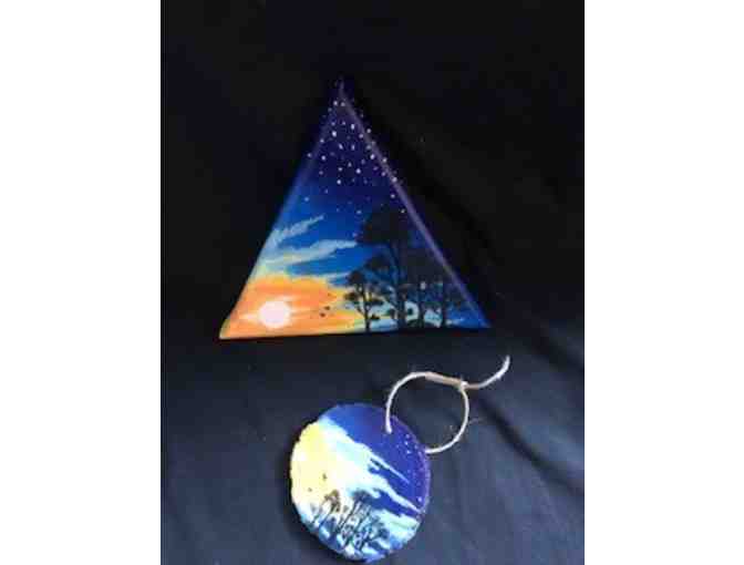 Visit AubreyGArts on Etsy or locally in Chattanooga at The Funky Monkey for custom hand painted wood slice ornaments that are either made to order or painted directly from reference pictures, roughly 3- 3 1/2 inches in diameter. Made for any season, holiday, or of personal memories.