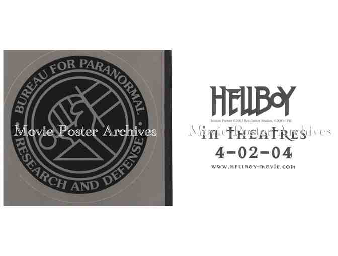 DESCRIPTION: This is 6 stickers from the premiere of Hellboy with the front showing the logo of the Bureau For Paranormal Research and Defense and the back stating Hellboy in theatres 4-02-04.