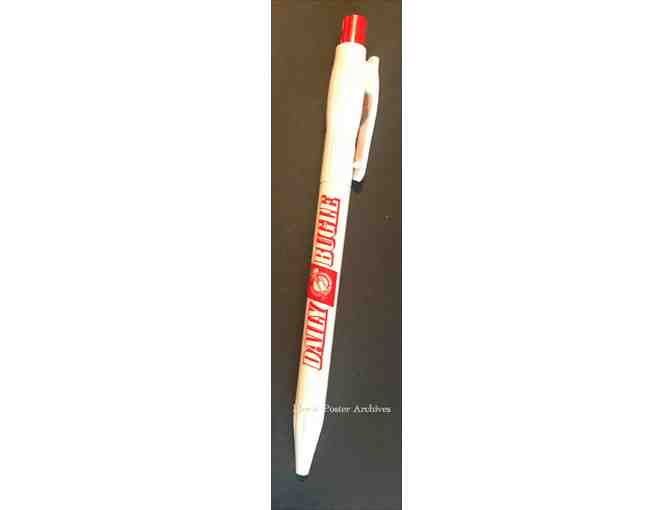 DESCRIPTION: This is a white click pen given out at the premiere with a red top (clicker) and written on the side in red states, Daily Bugle with the newspaper logo.